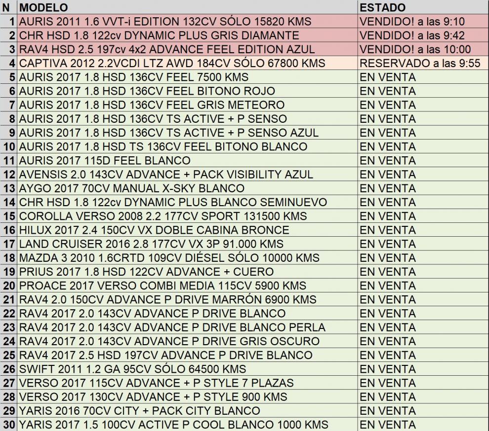 Con más de 30 unidades disponibles, aprovechando el inicio de verano y terminando la primera mitad del año, pide cita previa y visita nuestras instalaciones SÓLO DURANTE ESTA SEMANA (Jueves 29, Viernes 30 de Junio y Sábado 1 de Julio), y consigue alguna de las OFERTAS LIMITADAS DE LIQUIDACIÓN DE STOCK Y CIERRE DE SEMESTRE EN EXCLUSIVA PARA CLIENTES DE TOYOTA OURENSE.